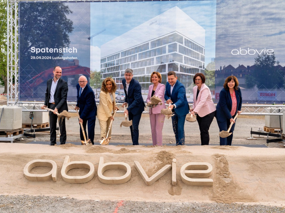 In einer feierlichen Zeremonie enthüllte Dr. Martin Gastens, Vice President Biologics Drug Product Development & Geschäftsführer Forschung und Entwicklung bei AbbVie Deutschland, gemeinsam mit Ministerpräsidentin Malu Dreyer, Mario Brandenburg, Parlamentarischer Staatssekretär im Bundesministerium für Bildung und Forschung, Jutta Steinruck, Oberbürgermeisterin der Stadt Ludwigshafen, sowie den globalen AbbVie Vertreter*innen, Tom Hudson, MD, Senior Vice President, Global Research, Chief Scientific Officer, AbbVie, und Azita Saleki-Gerhardt, Ph.D., Executive Vice President, Chief Operations Officer, AbbVie und Aufsichtsratsvorsitzende von AbbVie Deutschland eine Installation. Mit dem anschließenden traditionellen Spatenstich wurde der Bau symbolisch begonnen. Geplant ist die Fertigstellung des Forschungsgebäudes im Jahr 2027.