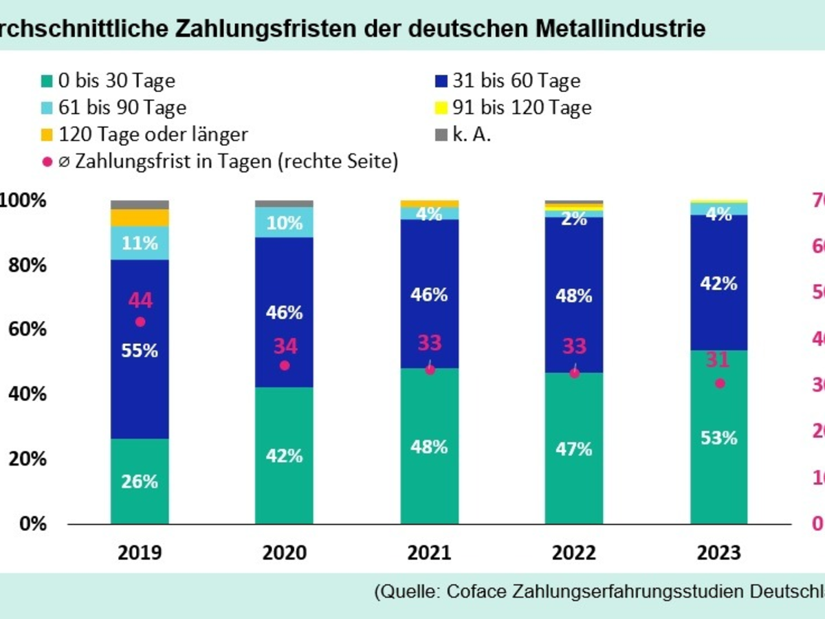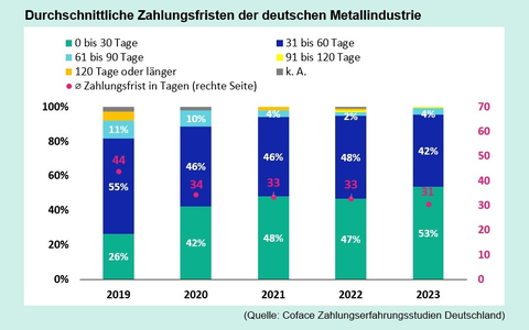Seit 2016 befragt Coface einmal im Jahr deutsche Unternehmen aus 13 breit gefächerten Branchen nach deren Zahlungserfahrungen.[1] In der Metallindustrie ist es demnach gängige Praxis, dass Firmen ihren Kunden ein Zahlungsziel, also einen Lieferantenkredit, einräumen. Im Jahr 2019 gewährten noch 82 Prozent kurzfristige Zahlungsfristen von bis zu zwei Monaten und immerhin 16 Prozent der Kunden hatten die Möglichkeit, erst nach zwei Monaten zu zahlen. Diese Situation hat sich verändert, denn 2023 versuchen die Metallbetriebe, immer früher an ihr Geld zu kommen: So bittet über die Hälfte der befragten Unternehmen (53 Prozent) um eine Zahlung innerhalb der ersten 30 Tage nach Lieferung und nur noch 5 Prozent gewähren Zahlungsfristen von zwei Monaten oder länger. Die durchschnittliche Zahlungsfrist in der Metallbranche ist von 44 Tagen im Jahr 2019 auf 31 Tage im Jahr 2023 zurückgegangen. Zum Vergleich: Im gleichen Zeitraum sank das Zahlungsziel in Deutschland branchenübergreifend nur geringfügig von 34 auf 32 Tage.