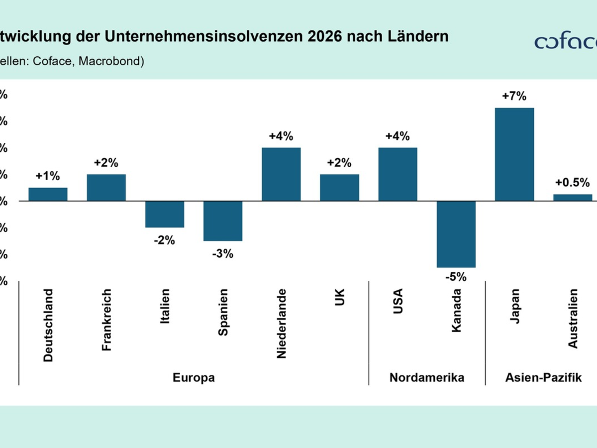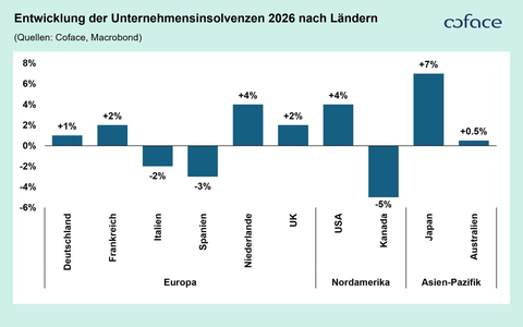 In Nordamerika zeigt sich ein gespaltenes Bild: In den USA erwartet Coface einen Anstieg um 4 Prozent, bedingt durch den starken Einfluss politischer Maßnahmen, schwächeres Wachstum und strukturelle Verwundbarkeiten. Kanada (-5 Prozent) hingegen dürfte nach mehreren Jahren kräftiger Anstiege seinen Erholungskurs fortsetzen und eine deutliche Entlastung erleben. Auch im asiatisch-pazifischen Raum erwartet Coface eine uneinheitliche Entwicklung. In Japan (+7 Prozent) steigen die Insolvenzen aufgrund schwacher Nachfrage und eines anhaltend hohen Zinsniveaus voraussichtlich weiter an, während Australien (+0,5 Prozent) nach ausgeprägten Nachholeffekten in eine stabile Seitwärtsbewegung übergehen dürfte.