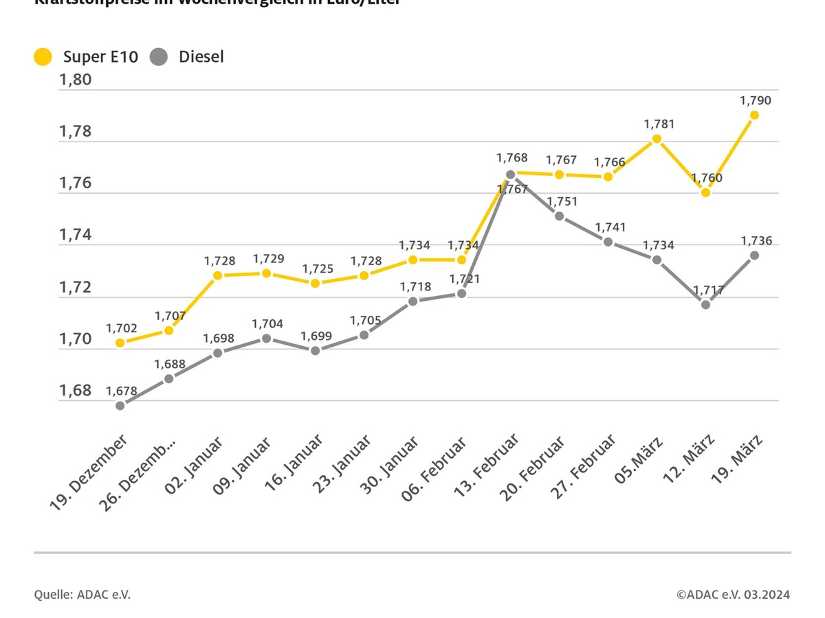 Benzinpreis klettert auf Jahreshöchststand / Für Super E10 geht es im ADAC Wochenvergleich um drei Cent nach oben, Diesel 1,9 Cent teurer / Rohölpreis zieht deutlich an