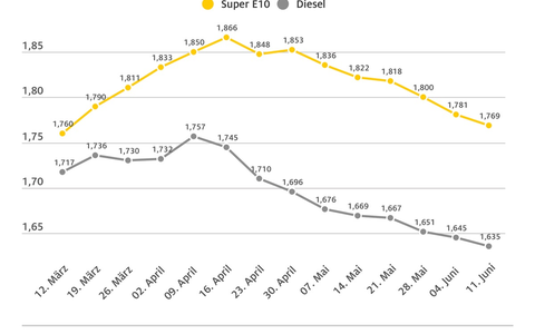 Preis für Benzin und Diesel erneut gesunken / Super E10 kostet aktuell 1,769 Euro / Dieselpreis bei 1,635 / Abends Tanken deutlich billiger als morgens