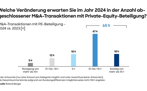 "Hinter dem deutlichen Stimmungswandel in der Branche stehen verschiedene Faktoren", sagt Christof Huth, Partner bei Roland Berger. "Wie in unserem letztjĂ€hrigen PE Outlook erwartet, gab es 2023 tatsĂ€chlich einen deutlichen RĂŒckgang des PE-Transaktionsvolumens um 24 Prozent gegenĂŒber 2022 - wegen steigender Inflation, höherer Zinsen und anderer makroökonomischer Faktoren. 2024 sehen die Rahmenbedingungen dagegen vielversprechender aus, mit stabilen oder potenziell sinkenden ZinssĂ€tzen sowie einer Erholung in den meisten wichtigen europĂ€ischen Volkswirtschaften. Zudem dĂŒrften 2024 viele verschobene Deals nachgeholt werden." So erwarten 90 Prozent der Befragten, dass die 2024 verfĂŒgbaren Investitionsziele mindestens genauso attraktiv oder attraktiver sein werden als im Vorjahr - 2023 sahen dies nur 72 Prozent so.