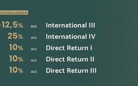 Deutschlands größter Private-Equity-Dachfonds im Retail-Segment - der International III - schüttet rund 12,5 Prozent aus und überschreitet damit die Gewinnschwelle. Beim International IV ist es die erste Auszahlung. Die betreffenden Anlegerinnen und Anleger erhalten dabei 25 Prozent. Der Direct Return III schüttet ebenfalls erstmalig aus. Bei Direct Return I und II ist es bereits die fünfte bzw. dritte Auszahlung.