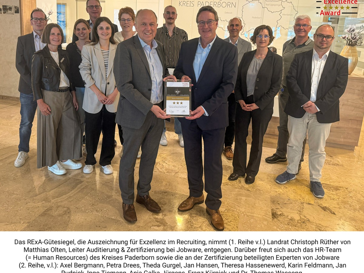"Der drohende Fachkräftemangel birgt vor allem im Öffentlichen Dienst die Gefahr, dass Services der Bevölkerung nur in begrenztem Umfang oder mit erheblichen Wartezeiten angeboten werden können. Das kann sich der Kreis Paderborn nicht leisten und geht mit gutem Vorbild voran. Mit der Selbstverpflichtung zu exzellentem Recruiting hat er sich unser Gütesiegel wahrlich verdient", gratulierte Matthias Olten von Jobware, zur Auszeichnung.