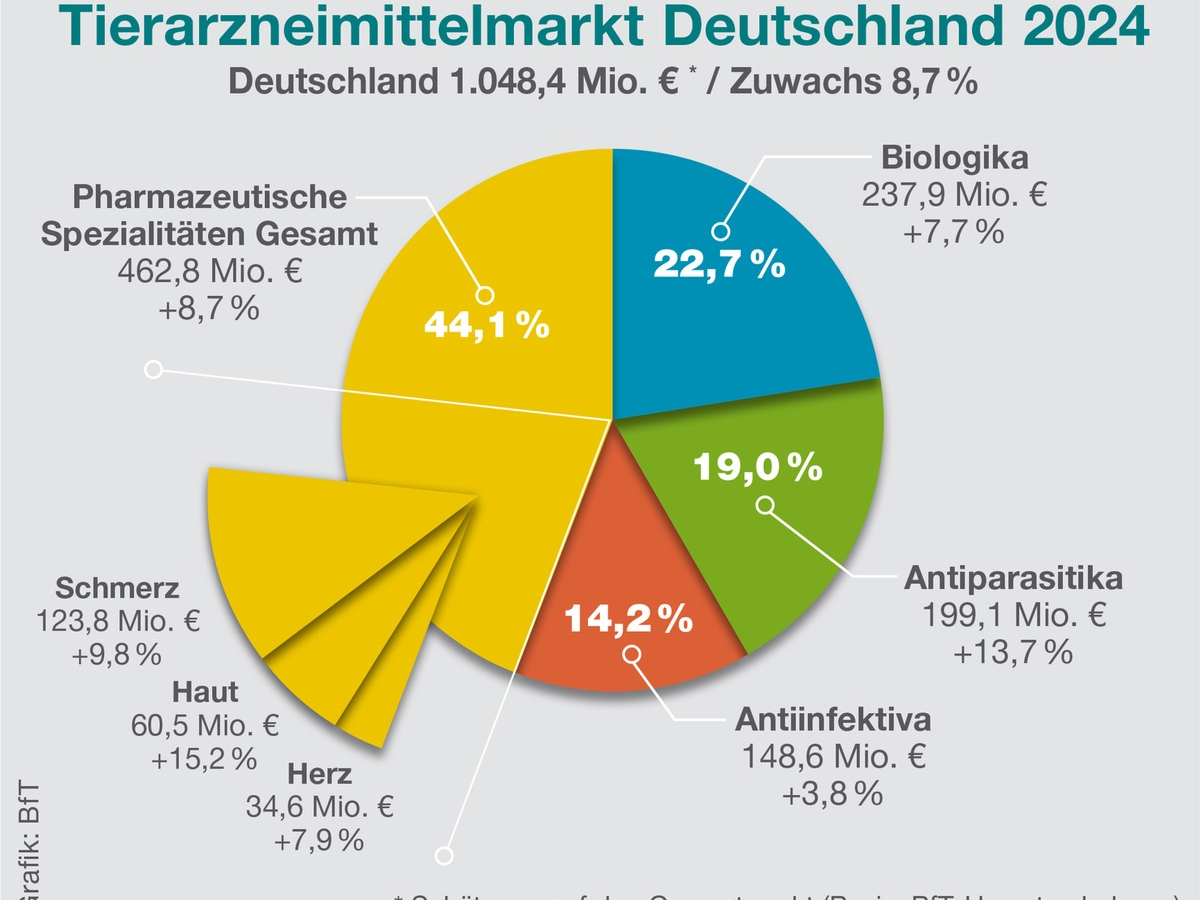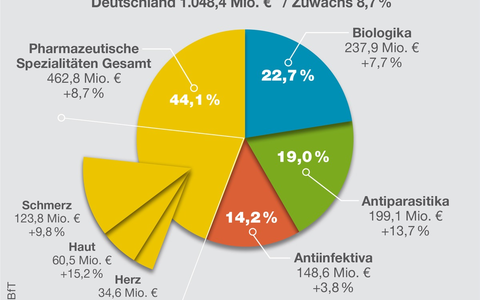 Bei den Teilmärkten entfielen 462,8 Mio EUR (+8,7%) bzw. 44,1% auf pharmazeutische Spezialitäten, 22,7% bzw. 237,9 Mio EUR (+7,7%) auf Impfstoffe, 19% bzw. 199,1 Mio EUR (+13,7%) auf Antiparasitika sowie auf Antiinfektiva 14,2% bzw. 148,6 Mio EUR (+3,8%).