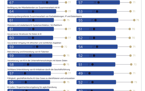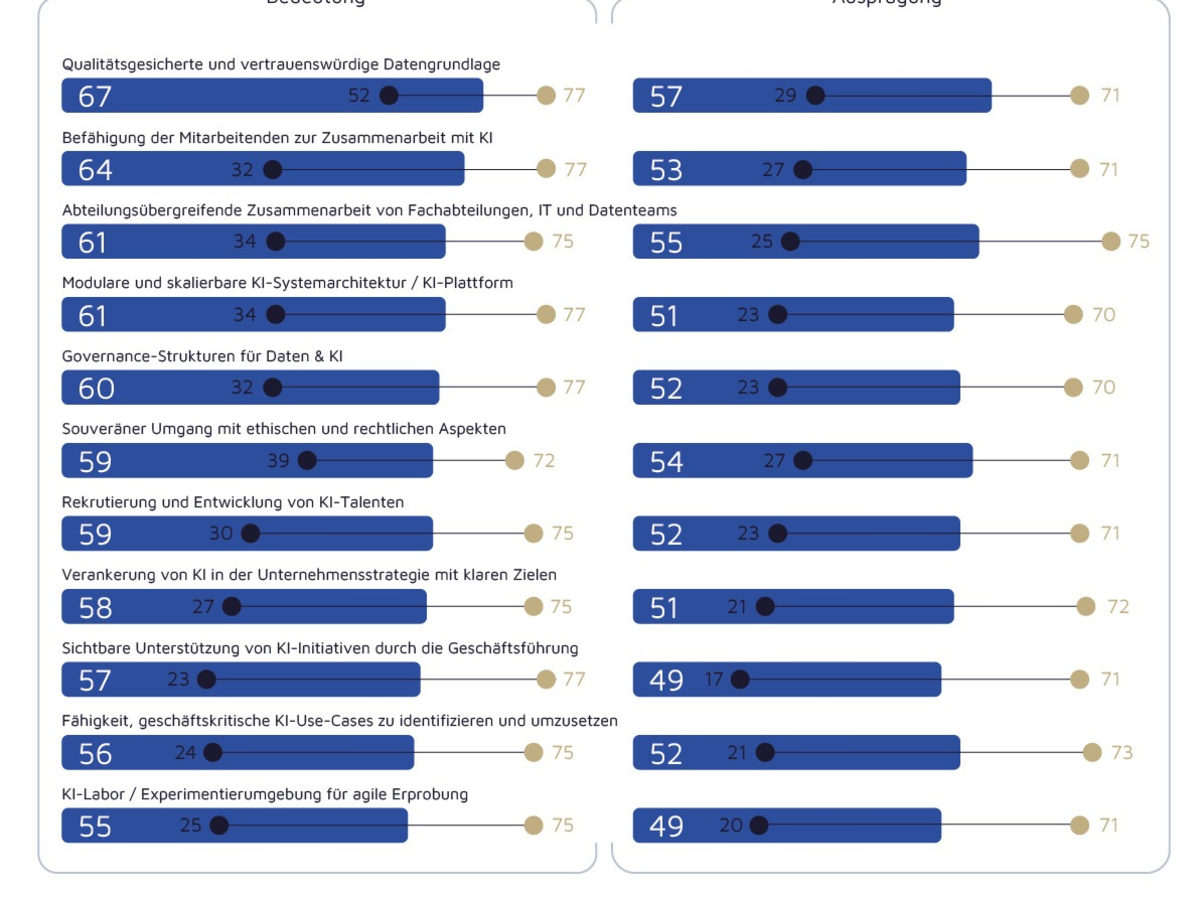 Ebenso bewerten Vorreiter die Relevanz einzelner Erfolgsfaktoren beim KI-Einsatz anders als die NachzĂŒgler. WĂ€hrend sowohl Vorreiter als auch NachzĂŒgler eine qualitĂ€tsgesicherte Datengrundlage als erfolgskritisch fĂŒr KI-Anwendungen erachten, messen Vorreiter Faktoren wie der abteilungsĂŒbergreifenden Zusammenarbeit zwischen Datenteams und Fachabteilungen, soliden Governance-Strukturen oder der BefĂ€higung der Mitarbeitenden eine deutlich höhere Bedeutung bei, als dies die NachzĂŒgler tun.