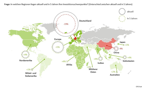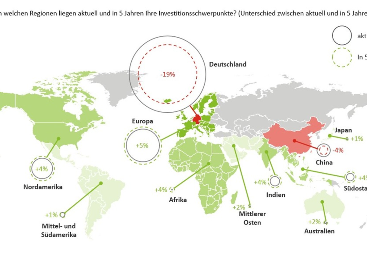 Von der Neuausrichtung der Investitionen profitieren vor allem Europa (exkl. Deutschland) und Nordamerika, aber auch Indien und Südostasien. China verliert hingegen als Investitionsziel an Relevanz (- 4 Prozentpunkte auf 9%).