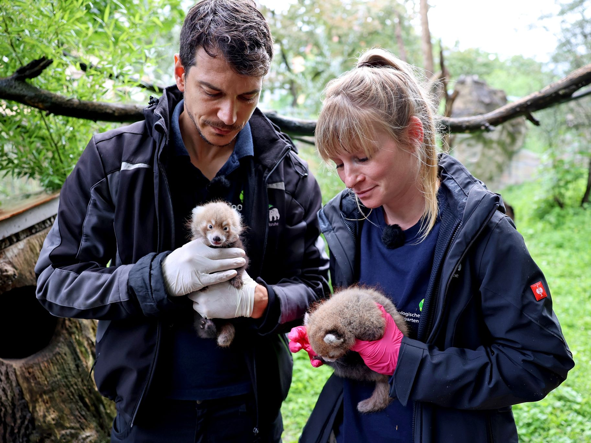 Zum ersten Mal sind im Karlsruher Zoo Rote Pandas zur Welt gekommen. Bei den Jungtieren handelt es sich nach Angaben vom Freitag um ein Weibchen und ein MĂ€nnchen. Namen hĂ€tten sie noch nicht. FĂŒr eine erste Tierarztkontrolle wurden das Duo nun aus seiner Höhle geholt, wie ein Sprecher mitteilte. Der Vater des am 25. Juni geborenen Nachwuchses heiĂt Terai, die Mutter Akuti.