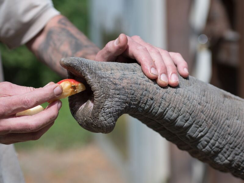 • Ein Tierpfleger gibt einem Elefanten Futter. - Foto: Alejandro Posada/Heidelberg Zoo/Max-Planck-Institut für Intelligente Systeme/dpa