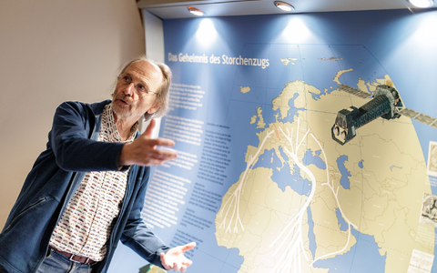 • Vogelschützer Alfons Rolf Bense zeigt im Westfälischen Storchenmuseum eine Karte mit den Zugstrecken der Störche zu den Winterquartieren. Eine Hauptroute führt nach Westen über die Meerenge von Gibraltar nach Afrika. Viele dieser Westzieher fliegen aber gar nicht mehr so weit über das Mittelmeer. Die andere Hauptroute führt Richtung Osten über den Bosporus nach Afrika. - Foto: David Ebener/dpa