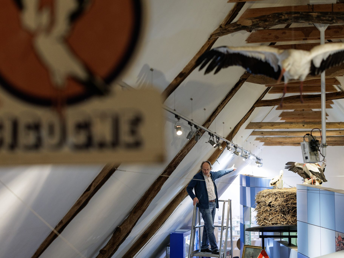 Ein Weißstorch-Paar steht bei blauem Himmel in seinem Horst. Petershagen im Kreis Minden-Lübbecke gilt mit seinen zahlreichen Horsten als Storchenhauptstadt von Nordrhein-Westfalen. - Foto: David Ebener/dpa Vogelschützer Alfons Rolf Bense zeigt im Westfälischen Storchenmuseum eine Karte mit den Zugstrecken der Störche zu den Winterquartieren. Eine Hauptroute führt nach Westen über die Meerenge von Gibraltar nach Afrika. Viele dieser Westzieher fliegen aber gar nicht mehr so weit über das Mittelmeer. Die andere Hauptroute führt Richtung Osten über den Bosporus nach Afrika.  - Foto: David Ebener/dpa «Storchenvater» und Autor Alfons Rolf Bense führt durch das Westfälische Storchenmuseum. Ein großes Exponat ist ein Original-Storchennest, das wegen Sanierungsarbeiten von einem maroden Schornstein genommen werden musste. Es wog fast eine Tonne. Museumsbesucher können über eine Leiter hineinschauen.  - Foto: David Ebener/dpa  Alfons Rolf Bense zeigt im Westfälischen Storchenmuseum ein Exponat zur Anatomie des Weißstorchs.  - Foto: David Ebener/dpa Die Zahl der Störche ist in Deutschland deutlich gestiegen. Das Lag nach Experteneinschätzung vor allem an den Westziehern. Viele von ihnen fliegen dank ausreichender Nahrungsquellen in Westeuropa nicht mehr die kraftraubende Langstrecke bis nach Afrika. Damit sind sie weniger Risiken ausgesetzt.  - Foto: David Ebener/dpa Ein Storch im Landeanflug.  - Foto: David Ebener/dpa