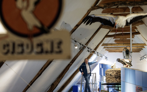 • «Storchenvater» und Autor Alfons Rolf Bense führt durch das Westfälische Storchenmuseum. Ein großes Exponat ist ein Original-Storchennest, das wegen Sanierungsarbeiten von einem maroden Schornstein genommen werden musste. Es wog fast eine Tonne. Museumsbesucher können über eine Leiter hineinschauen. - Foto: David Ebener/dpa