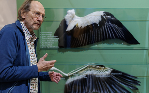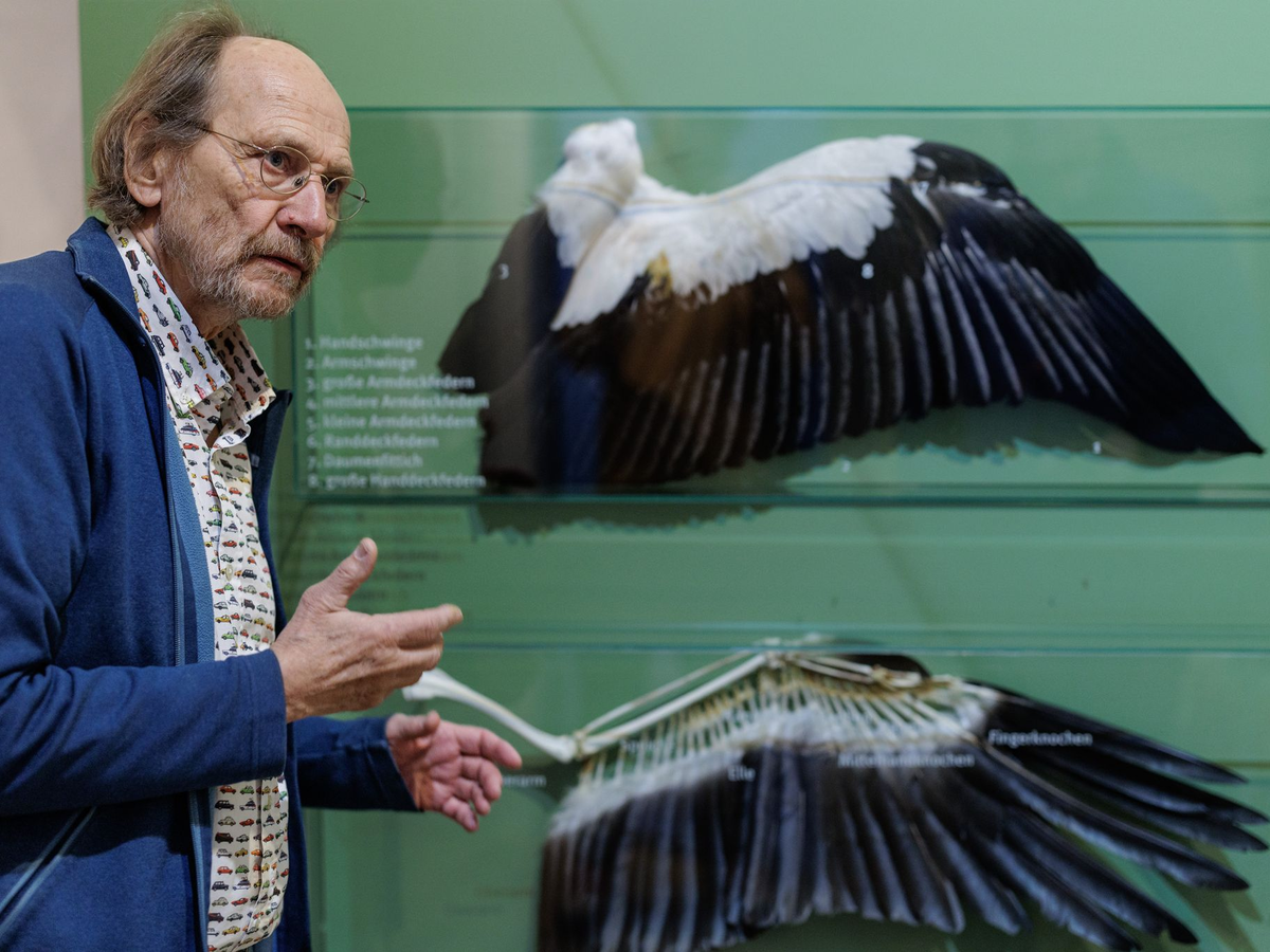 • Alfons Rolf Bense zeigt im Westfälischen Storchenmuseum ein Exponat zur Anatomie des Weißstorchs. - Foto: David Ebener/dpa