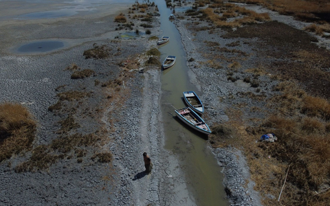 Boote an einem fast ausgetrockneten Ufer des Titicacasees nahe der Ortschaft Huarina in Bolivien. - Foto: Alexis Gomez/dpa